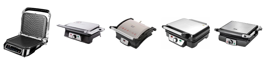 Denne model er også udstyret med en termostat til jævn manuel justering af arbejdspanelernes opvarmningstemperatur (fra 90 ° C til 230 ° C). Toplåget kan åbnes 180 °, og begge overflader kan bruges som en stor stegegryde. Arbejdsfladen opvarmes hurtigt på grund af varmelegemet indbygget i panelet.