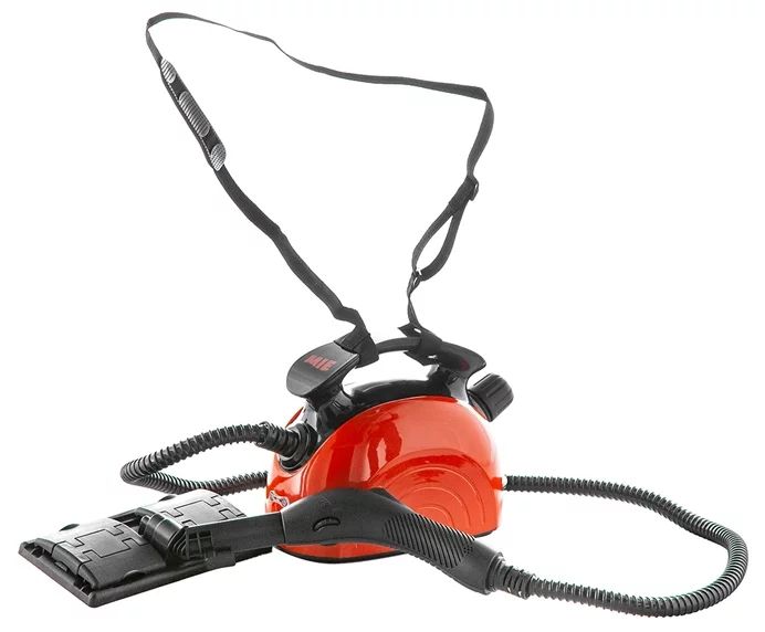 Flot og kraftfuld (1500 W) damprenser med en 1 liters tank. Renser et areal på ca. 75 m2 uden tilsætning af vand2... Vandet opvarmes på 6 minutter. Arbejder kontinuerligt i 1,5 timer. Damp leveres intensivt (40 g / min) med et maksimalt tryk på 3,5 bar. Baseret på materialet på overfladen, der skal rengøres, og graden af forurening, kan dampforsyningstilstand vælges: lodret eller vandret. Udstyret med en sikkerhedsventil, der frigiver overskydende damp.