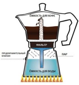 Princippet om kaffemaskine er baseret på naturligt damptryk. Når vand koger, dannes der damp, der stiger opad og klemmer vandet ind i det øverste rum. Vand er mættet med kaffe, der passerer gennem kaffefilteret, og en færdiglavet aromatisk drink kommer ind i den øverste del.
