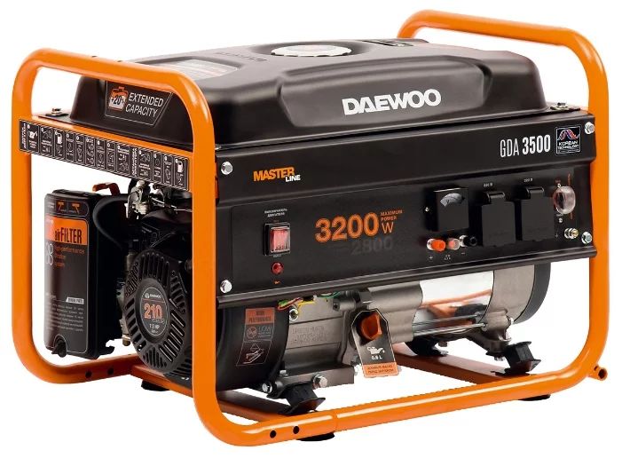 Ratingen åbner en 2-2,8 kW DAEWOO GDA 3500 benzingenerator.Du behøver ikke at kigge ind i tankene for at finde ud af mængden af benzin tilbage - informationen vises på kontrolpanelet. Gastanke er designet til 18 liter benzin - det største volumen på 2 kW modeller i vurderingen. Brændstofforbrug ved 50% belastning er kun 1,2 hk, ifølge ejerne er tallene ikke undervurderet. Generatoren betragtes som turist, men trækker let både en kværn og en hammerboremaskine. Der er en automatisk spændingsregulator og et voltmeter, som kan arbejde kontinuerligt i 15 timer. Hjul er ikke inkluderet, men der er huller til dem på rammen.