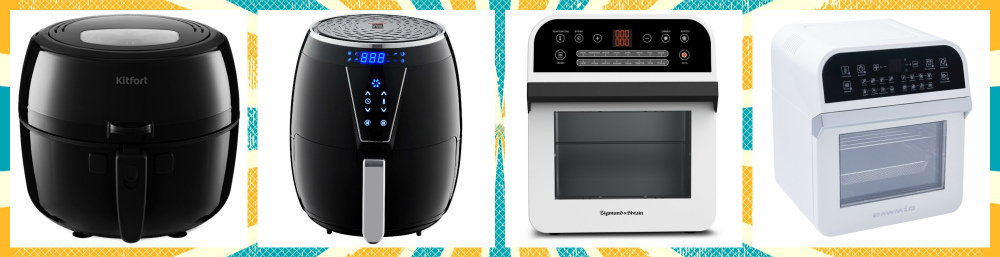 Selvom mange producenter og butikker deler airfryer og airfryer i forskellige undertyper, mener vi, at de er de samme. Da i begge tilfælde gitterbakkerne (hvor maden anbringes) og varmeelementerne er de samme. Snarere er det et marketingtræ. Vælg modellen i overensstemmelse hermed, uanset ovenstående bemærkning. De vigtigste parametre, når du vælger, er strøm og volumen (enhedens kapacitet) - de afgørende faktorer for valg. Lydstyrken på bogmærket og tilberedningstiden afhænger af dem. For eksempel i en lufttørrer Kitfort KT-2214 koger en hel grillet kylling på 40-50 minutter.